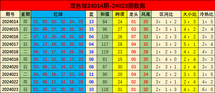 跨度分析:上期红球跨度为31,近10期最大跨度为31,最小跨度为15,跨度平均值为24.8。本期看好跨度21。